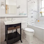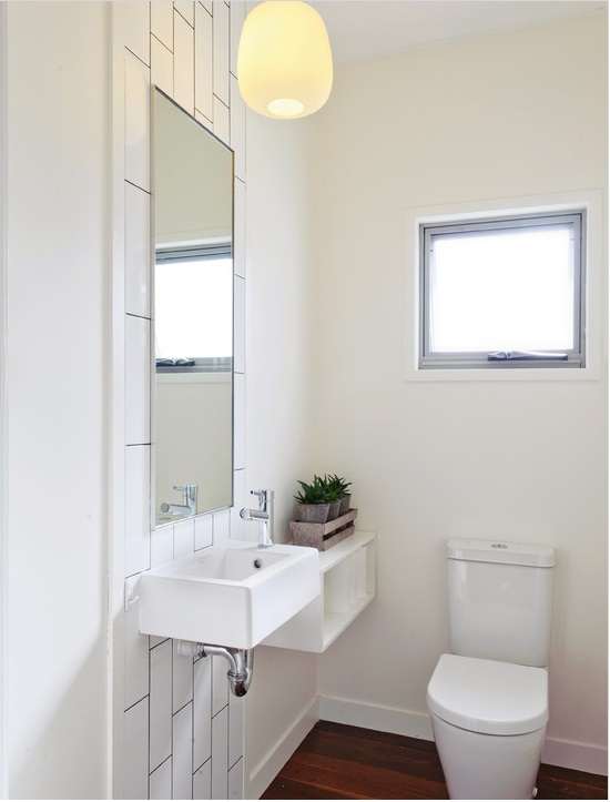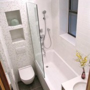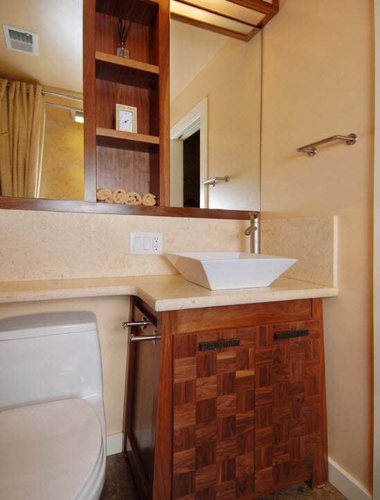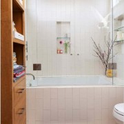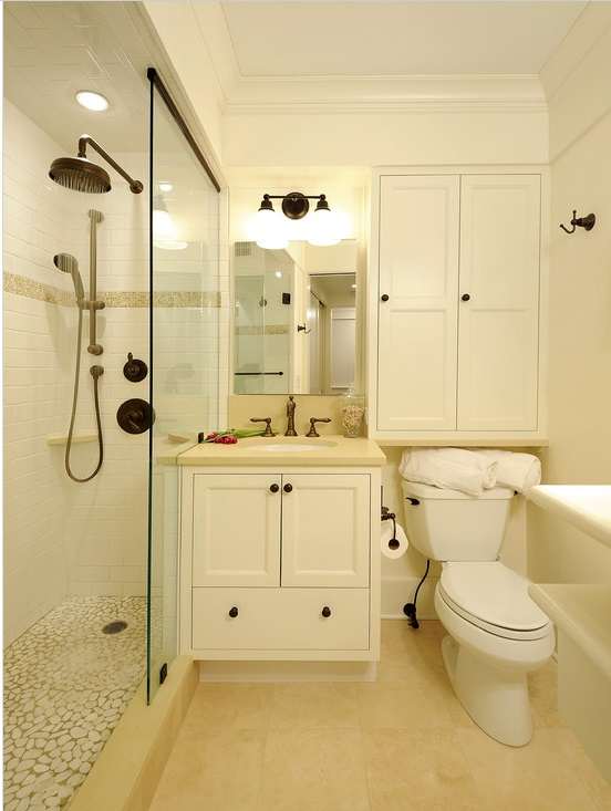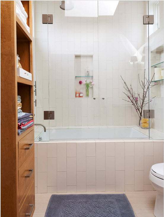 В маленьком помещении желательно использовать встроенные полки и шкафчики (если есть такая возможность). Ведь чем больше отдельных предметов в ванной, тем она кажется меньше.