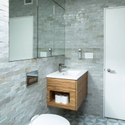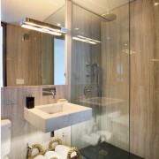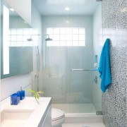 Его характеризируют простые четкие линии, максимум пространства и минимум деталей. Он идеально подходит для ванной комнаты с малой площадью. Ванная или душевая кабинка обязательно должны быть с ровным очертанием, если они прямоугольной формы, то с четкими углами. В этом случае не допускается изобилие разных тонов. Интерьер комнаты должен быть выдержанным в нескольких оттенках одного или двух цветов.