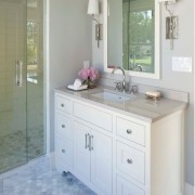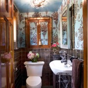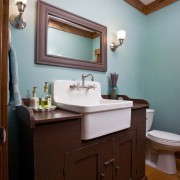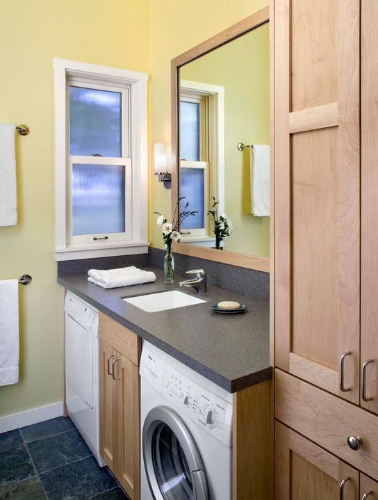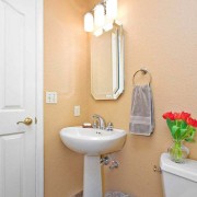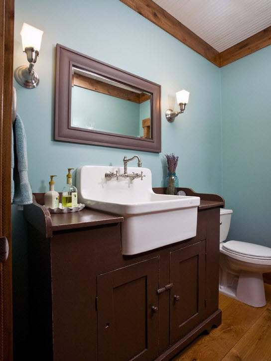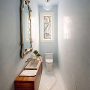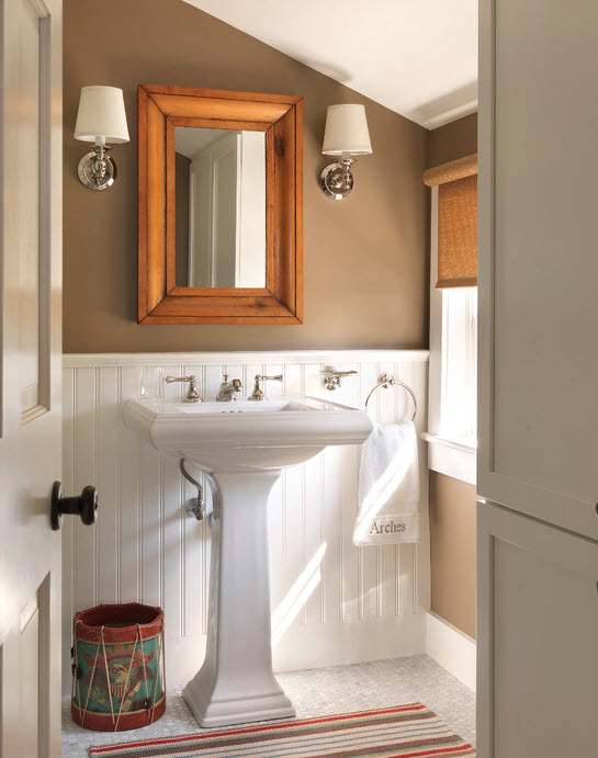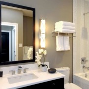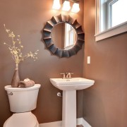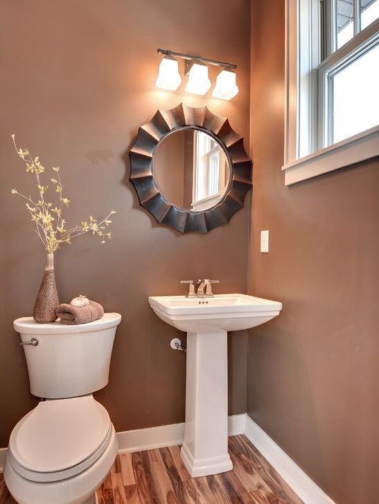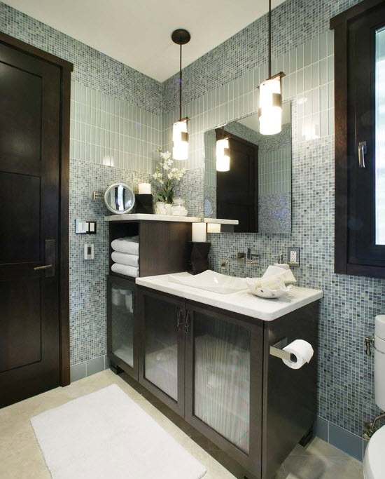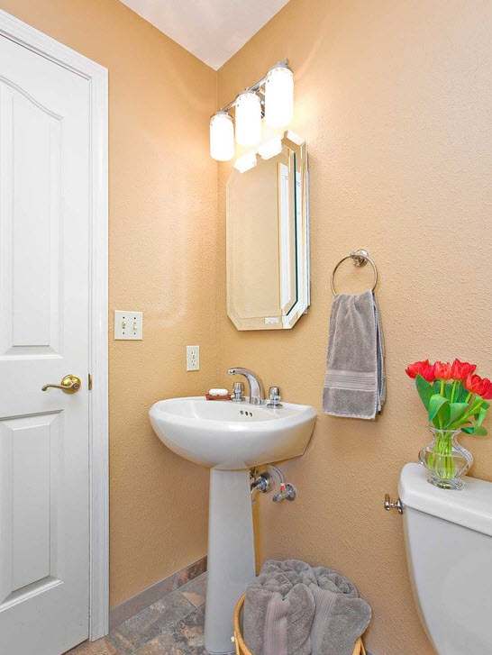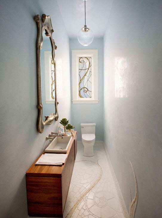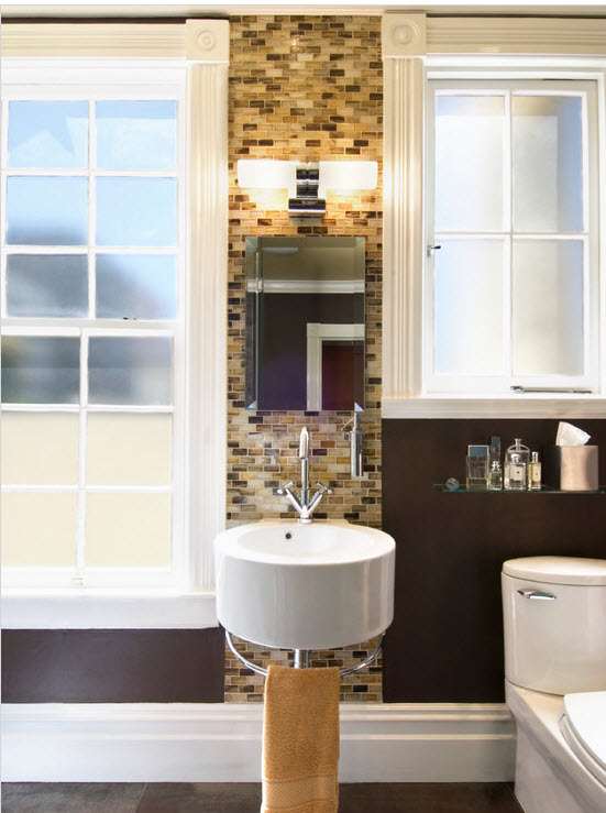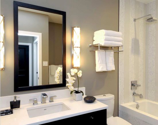 Аксессуаром №1 в этом помещении является зеркало. Если можно выбрать со встроенными светильниками, также светотехнические устройства могут быть закреплены по краям. Также в магазинах представленный большой выбор зеркал с разными полками или шкафчиками.