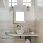 Если в ванной есть окна, то их надо украсить лаконично. Достаточно будет одной небольшой шторки под тон кафеля или горизонтальных жалюзи.