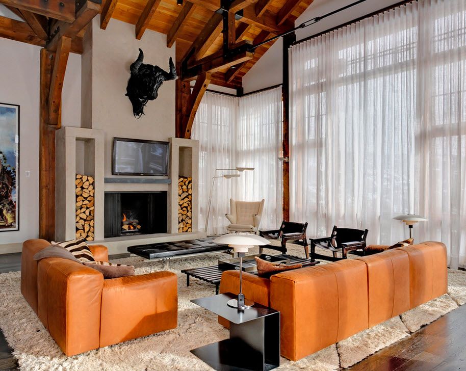 Стиль шале уходит корнями в Альпы. Внутреннее убранство комнат выдержано в духе дома простого пастуха и оформлено деревянными и каменными элементами. На стенах кроме штукатурки или побелки могут быть обработанные доски. В качестве напольного покрытия используется деревянный массив, пропитанный морилкой. Потолочные балки из бруса в таком помещении несут декоративный характер, их не нужно закрывать. Неотъемлемой частью гостиной в таком доме будет камин. Желательно, чтобы он имел не только декоративный характер. Дополнить интерьер можно простой мебелью крупных размеров. Она должна быть максимально простой и, возможно, иметь следы потертости.