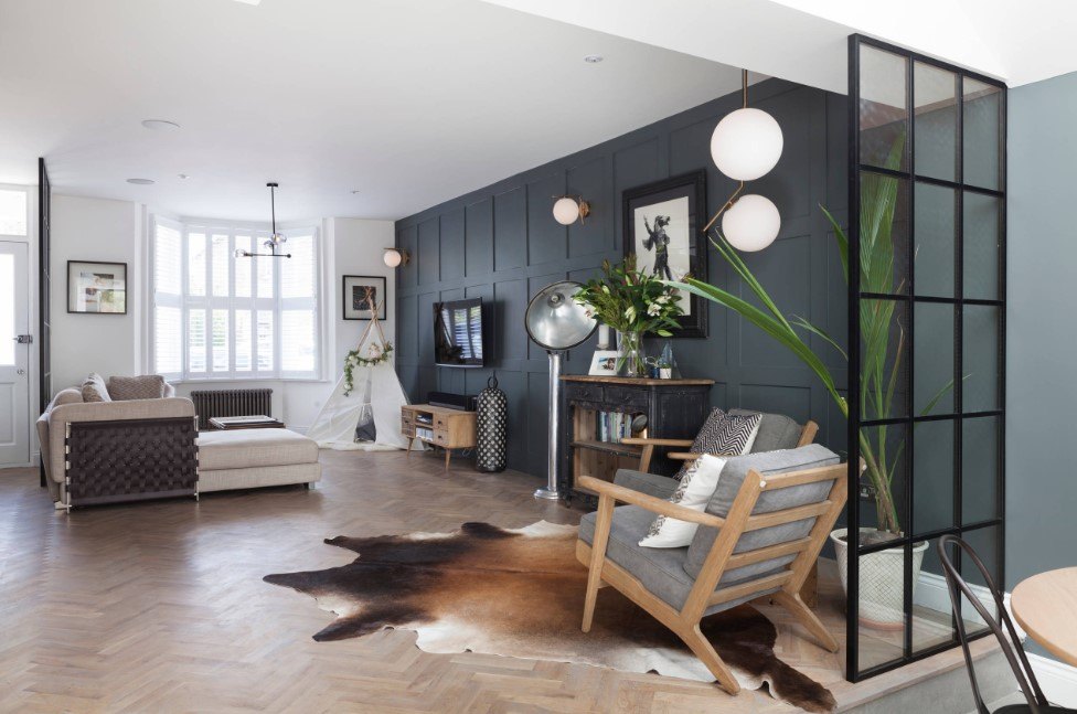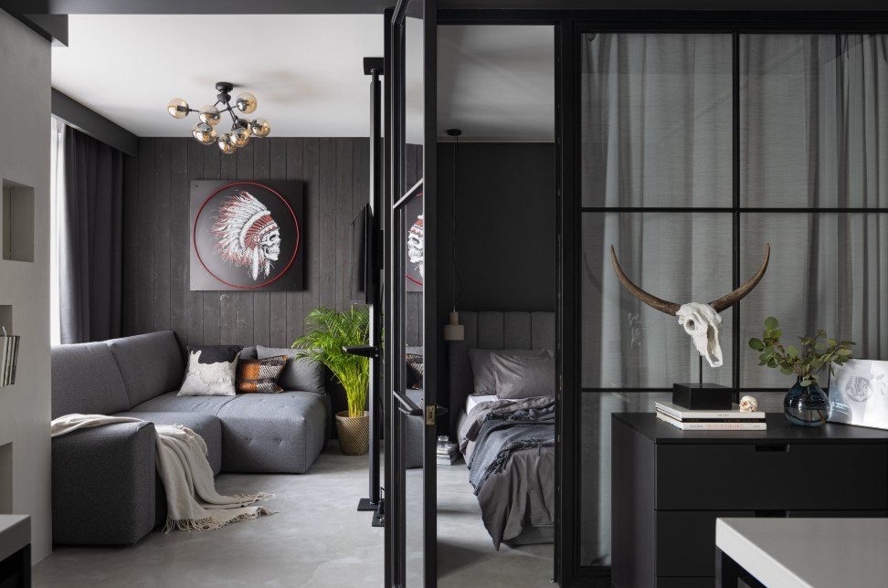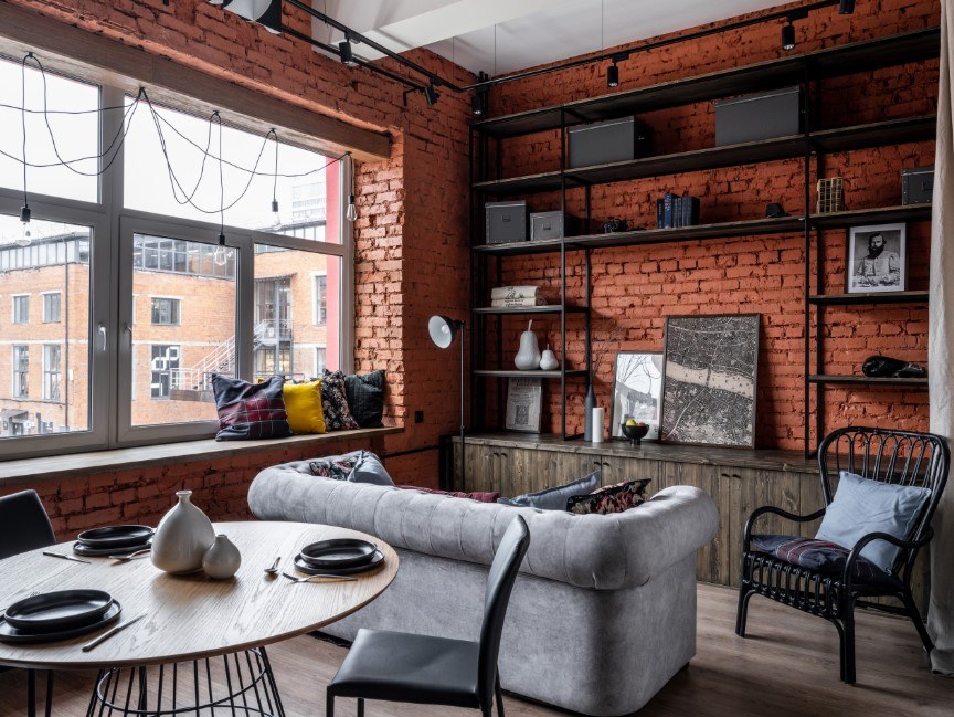Индустриальный лофт прекрасно дополняет гостиную скромных размеров с помощью панорамного остекления окон, бескаркасных кресел, небольшого лаконичного диванчика и стеллажей.