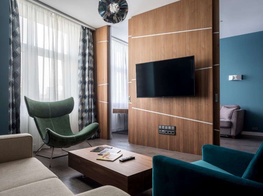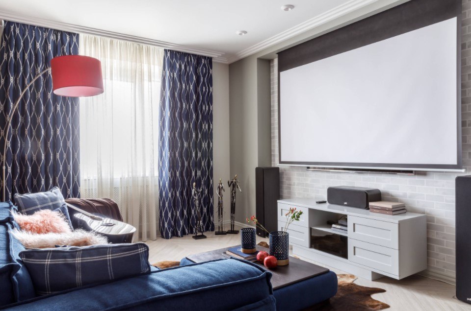 Прямоугольная гостиная будет менее пропорциональной, но этот нюанс можно подкорректировать с помощью горизонтальных линий в интерьере.