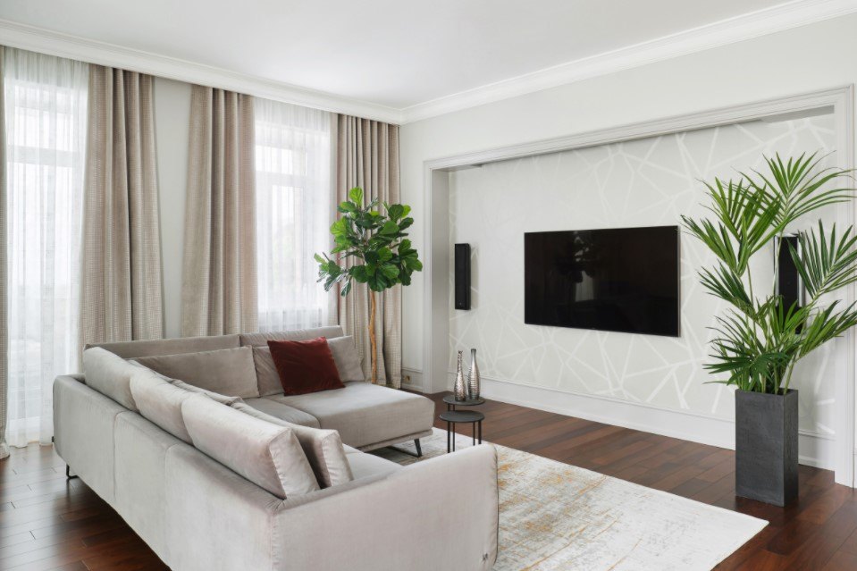 Для гостиной отлично подойдут живые элементы декора – комнатные цветы и растения, а также скромные дополнения в виде свечей, статуэток и книг.