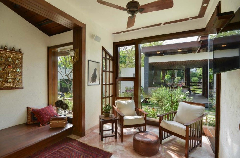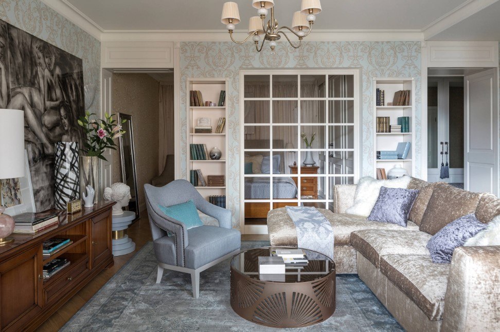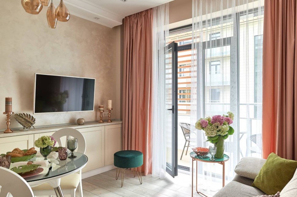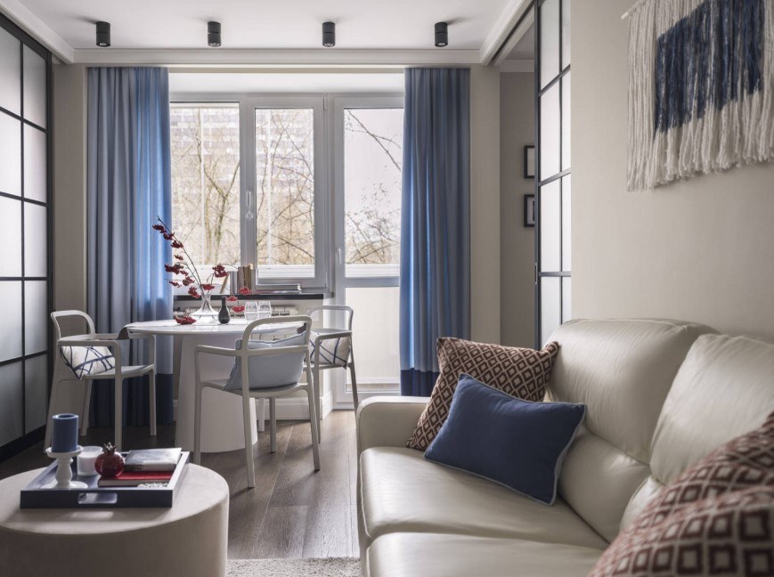 При выборе мебели отдаем предпочтение эргономичным моделям, например, полукруглой формы или со скошенными углами. Совмещение маленькой гостиной с балконом или лоджией – эффективный способ увеличения небольшого пространства.