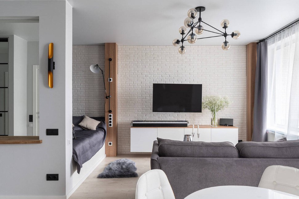 Отличный выбор для оформления стен небольшой гостиной – это покраска или обои в светлых тонах, 3D-обои с невероятной способностью зрительно расширять пространство, выкладка декоративным кирпичом, отделка ПВХ-панелями.