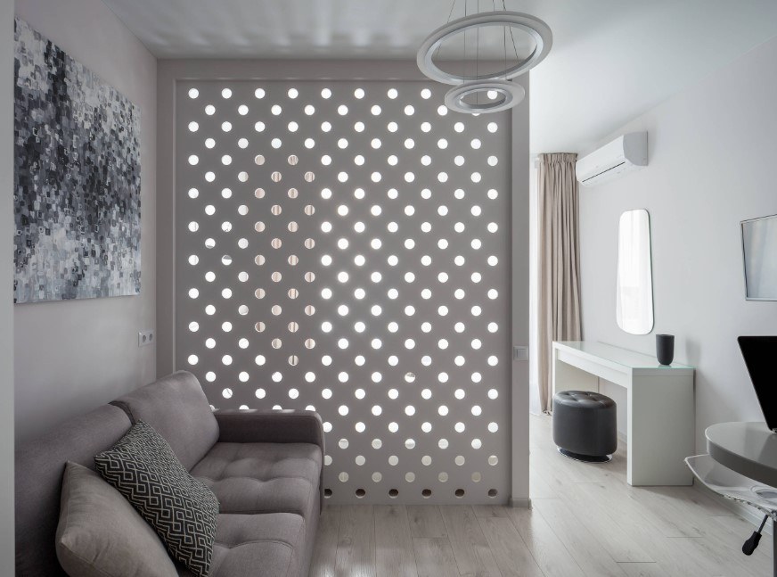 Отлично подходят для небольшого помещения элегантные серые тона. Оригинальным станет монохромное решение, а невероятно выразительным сочетание в интерьере черного, белого цвета и ярких акцентов.