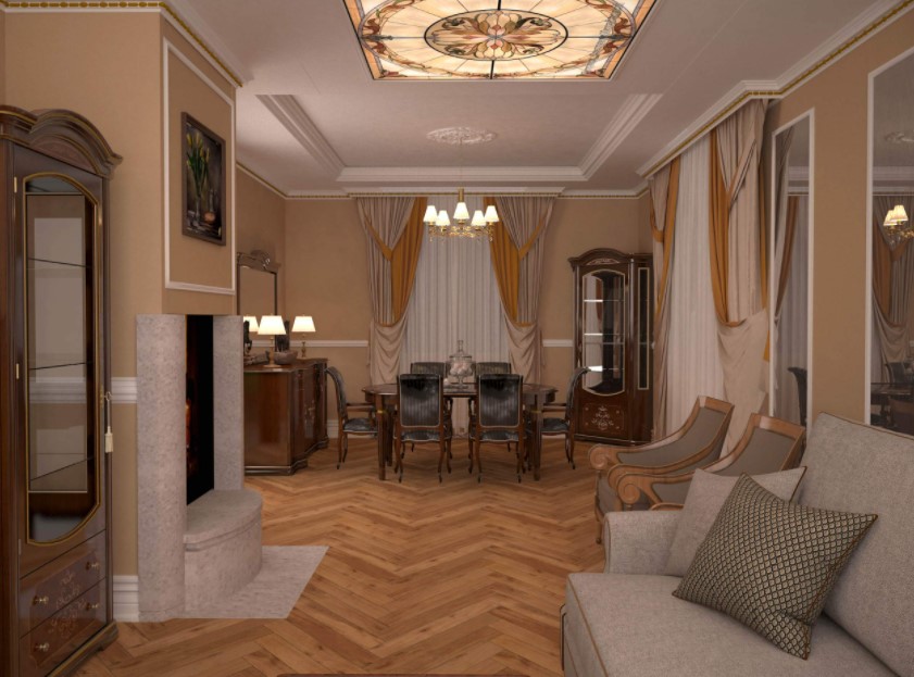 Эта гостиная оформлена в традиционном стиле с использованием дорогих материалов, таких как дерево, мрамор и текстиль. Мебель имеет роскошные формы и обивку из бархата или шелка. Хрустальная люстра и настенные бра создают уютную атмосферу.