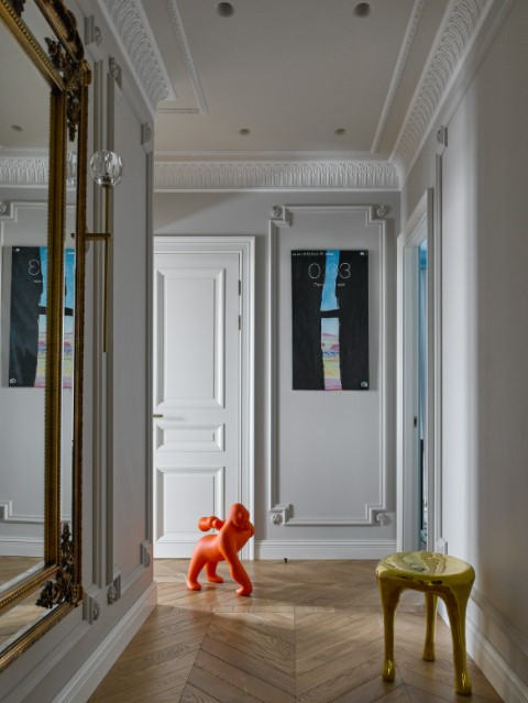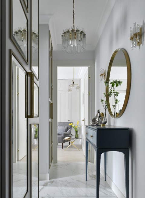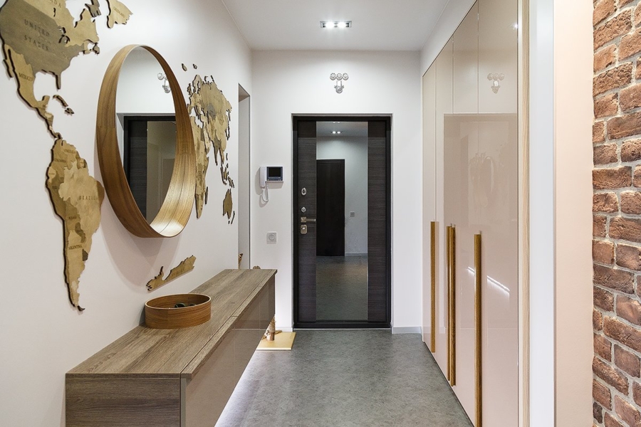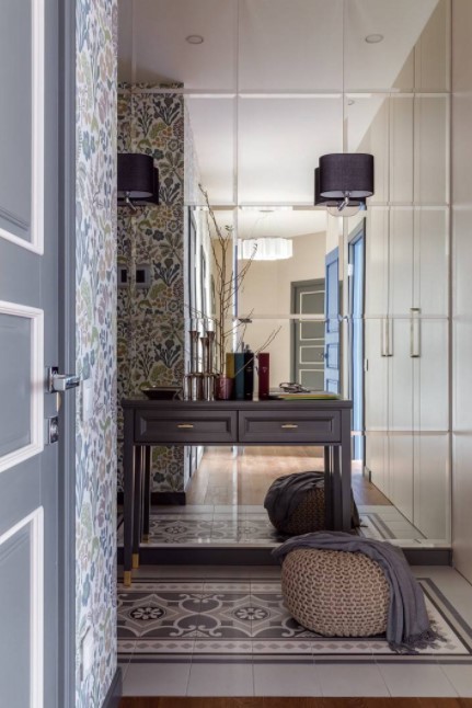 Размещение в узком коридоре нескольких зеркал, выбор зеркальных поверхностей для мебели, глянцевый пол и потолок – все эти отражающие элементы создают иллюзия объемного пространства.