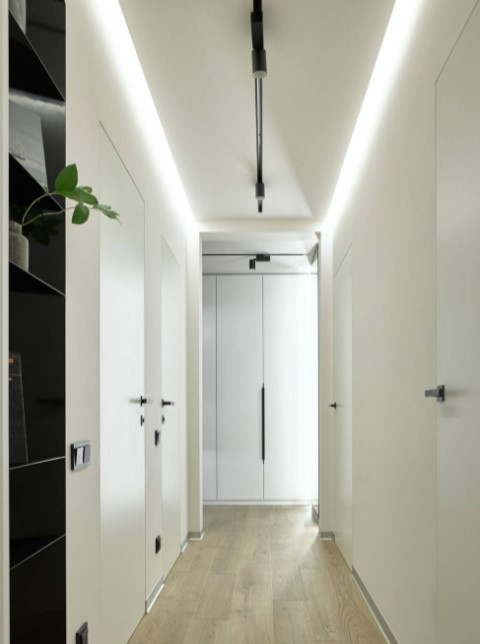 Для узкого коридора необходимо подобрать наиболее подходящие варианты потолочной отделки. Для низкой узкой комнаты идеально подойдёт натяжной потолок с глянцевой фактурой, которая благодаря отражательной способности зрительно увеличит высоту коридора.