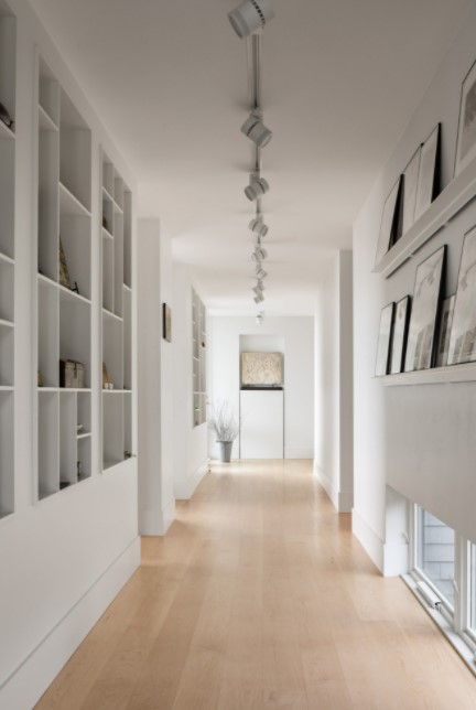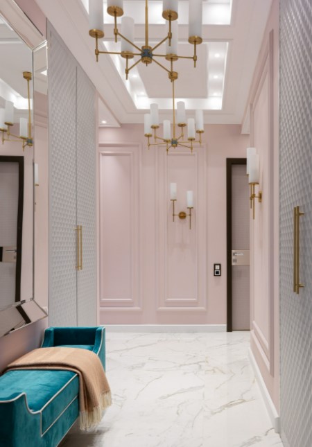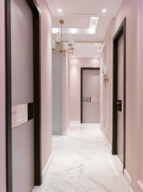 Обязательно при отделке узкого коридора использовать материалы и мебель светлых оттенков, которые визуально расширяют пространство: нежно-розового, молочного, бежевого, светло-голубого. Однако, можно сыграть и на контрасте, например, светлого потолка и стен с темным напольным покрытием.