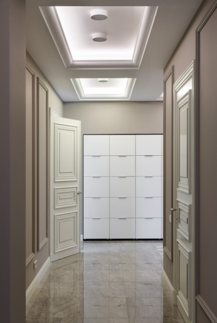 В большинстве квартир времен советской застройки коридор представляет собой узкую и длинную комнату без окон, но с несколькими дверными проемами: входная дверь, двери в совмещенный или разделенный санузел, межкомнатные двери в другие жилые комнаты.