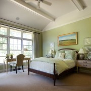 Присутствие рабочего стола или простой консоли для компьютера – частый элемент обстановки спальни больших размеров, иногда места хватает и для организации книжных стеллажей, открытых или закрытых систем хранения.