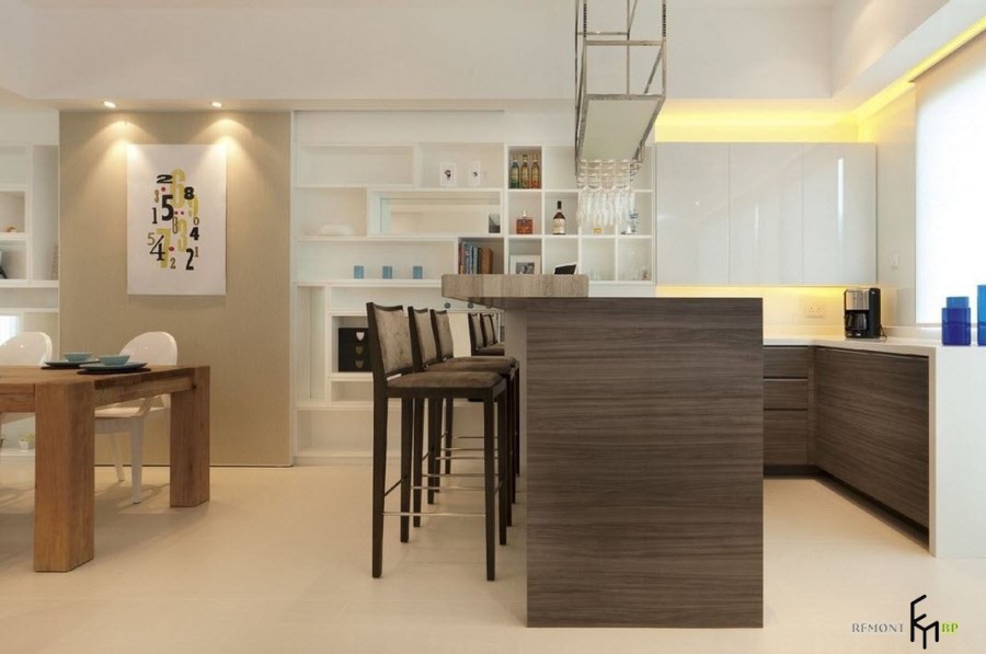 Если в квартире проживает менее четырех человек, то вариант с барной стойкой может стать удачным выходом. И, конечно же, использование светлой палитры в отделке помещения и выборе цвета древесины для изготовления мебели. Встроенная система хранения в тон к напольному покрытию, способна разместить все необходимые для домочадцев вещи. А открытые стеллажи и полки придают некоторую легкость мебельному гарнитуру, разбавляют его тяжеловесную структуру.