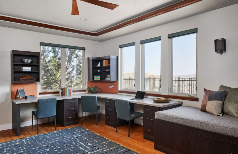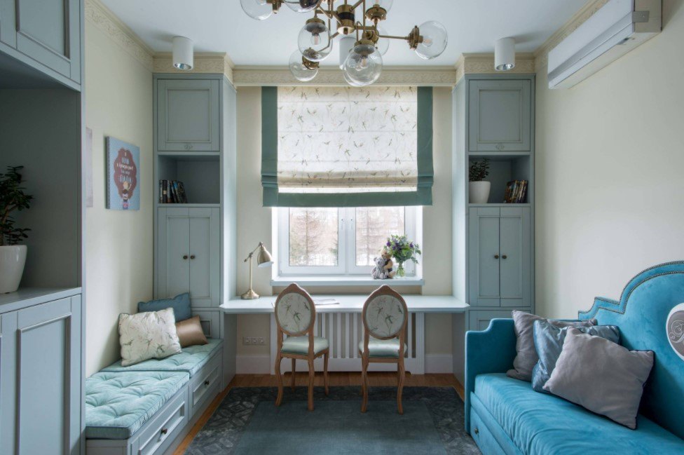 - Зона для работы и выполнения уроков. Здесь обязательная деталь – письменный стол. Для его установки выбирают самое максимально светлое место в помещении. К примеру, это может быть у окна. Если комната маленькая, то можно объединить письменный стол с подоконником, прикрыв их одной общей столешницей. Так выйдет и экономия пространства, и нестандартное оборудование детской.