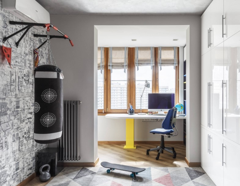 - Зона для спортивных занятий. Такое тоже можно организовать, если позволяет площадь комнаты. Если не позволяет, можно вмонтировать турник непосредственно в проходе комнаты.