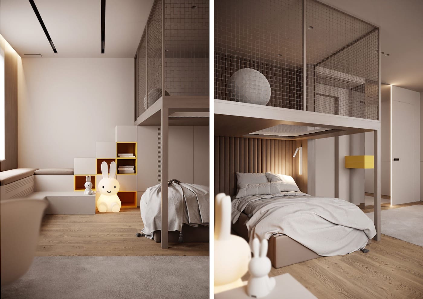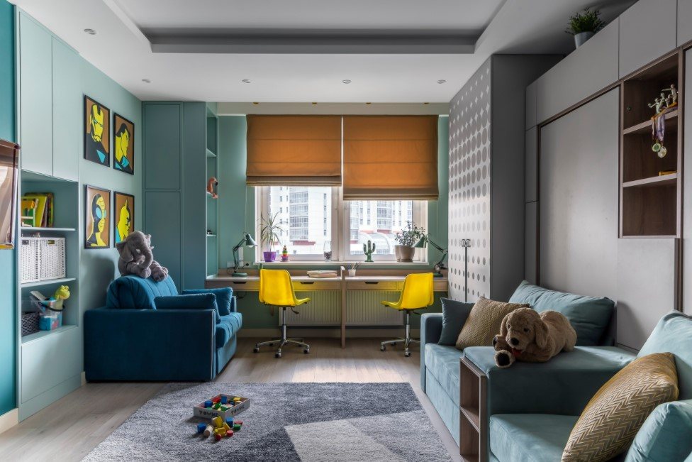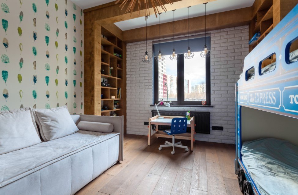 - Если детей в комнате проживает двое, может пригодиться двухэтажная кровать, или кровать, где спальное место расположено под другим спальным местом, и раскладывается на две полноценные отдельные кровати.