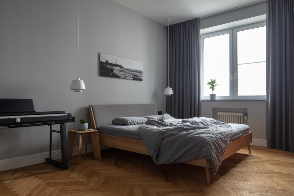 - Светлый деревянный пол и серые стены