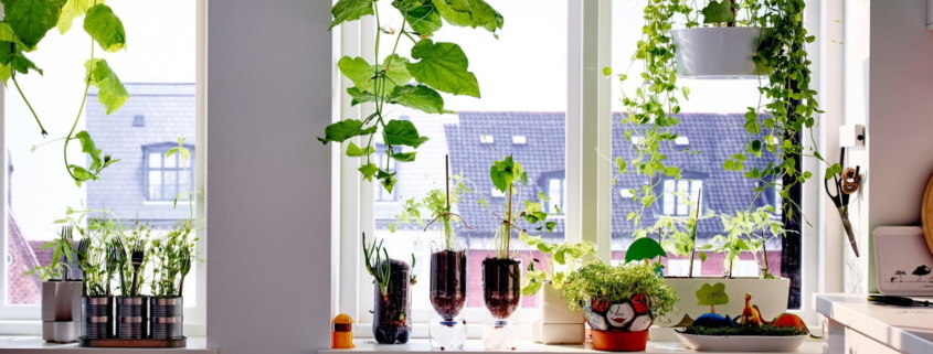 Цветочное озеленение на подоконнике является привычным и так сказать экологичным оформлением окон. Но чтобы создать масштабный декор, понадобятся вьющиеся растения, а также подвесные кашпо, которые допустимо подвести к карнизу вместо штор. Лишь бы он смог выдержать весовую нагрузку и не прогнуться.