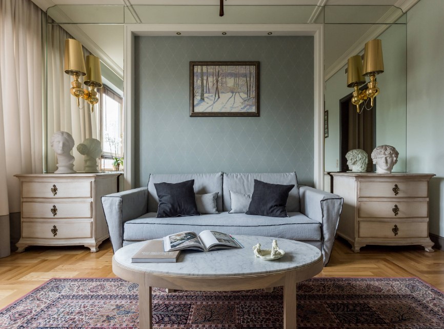 Зеркала крупного размера идеально подойдут для классического стиля. Его можно сочетать с красивой дорогой мебелью, изысканной фурнитурой, и интересными декор элементами.
