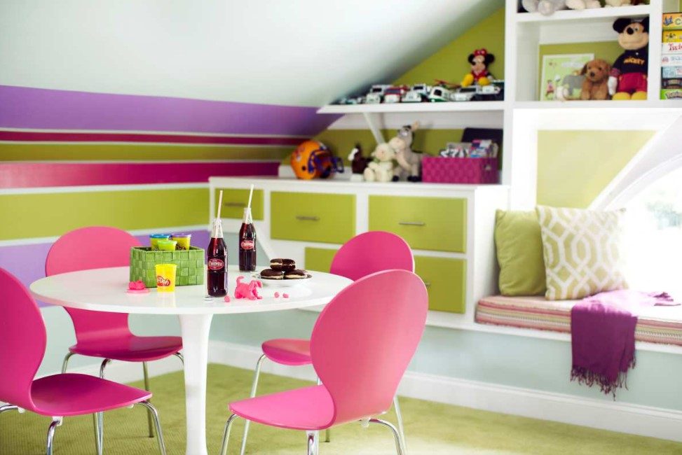 Чаще всего, детские игровые комнаты отделаны в ярких сочных цветах, могут быть зонированы с помощью разных контрастных цветов. Если же стены выполнены в белом цвете или светлых оттенках, то обязательно наличие ярких, насыщенных, цветных акцентов, деталей и элементов в интерьере.