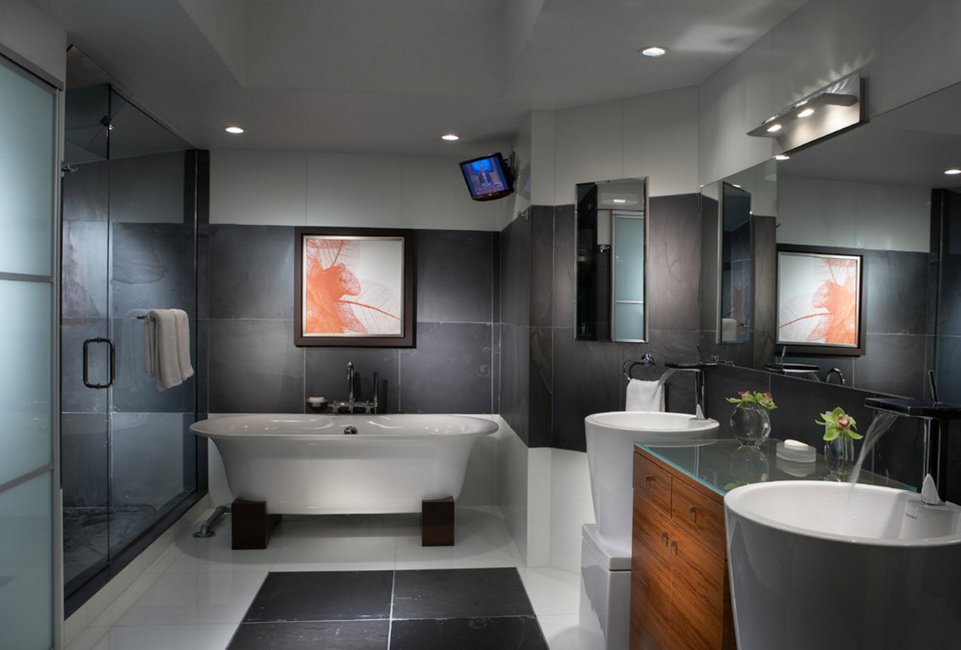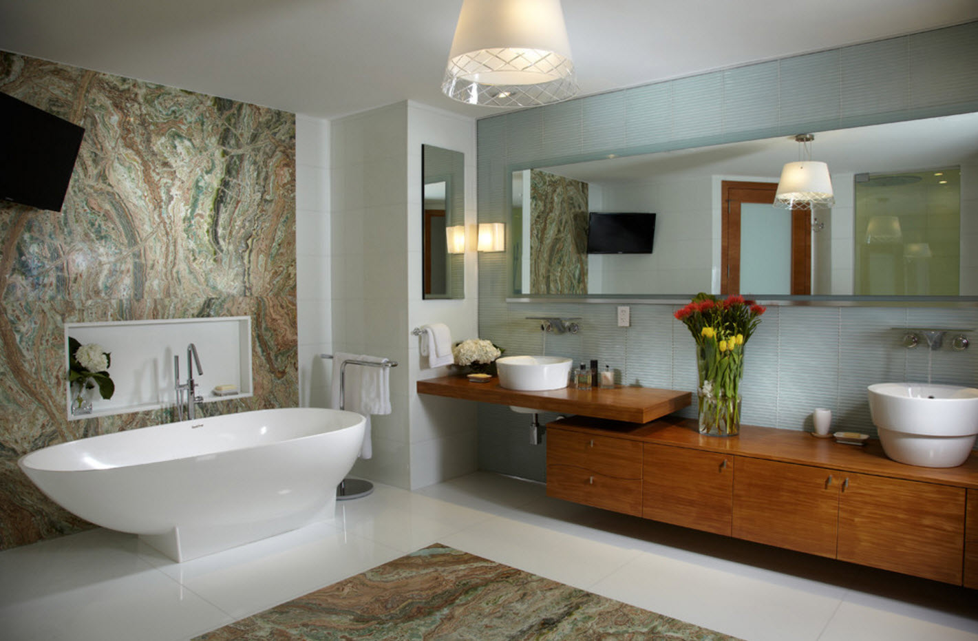 Отличительными особенностями ванной комнаты, находящейся в частных апартаментах, является достаточно большая площадь (по сравнению с помещениями стандартных и малогабаритных квартир), возможное наличие окна и нестандартное расположение систем коммуникаций. В частном доме можно по своему усмотрению переносить трубопровод, организовывать систему принудительной вытяжки, словом, упрощать функционал ванной комнаты без согласования своих действий с различными инстанциями. Все эти преимущества позволяют составить практичный, комфортабельный, функциональный и при этом красивый интерьер ванной комнаты с наименьшими затратами средств и времени.