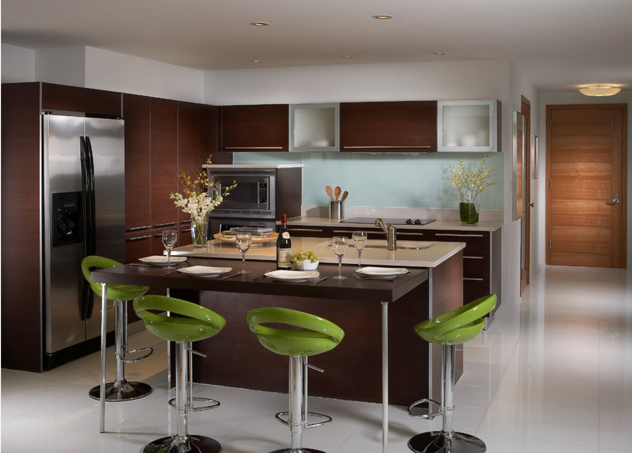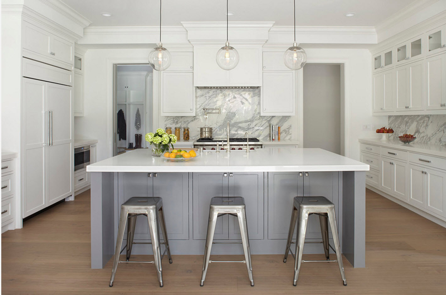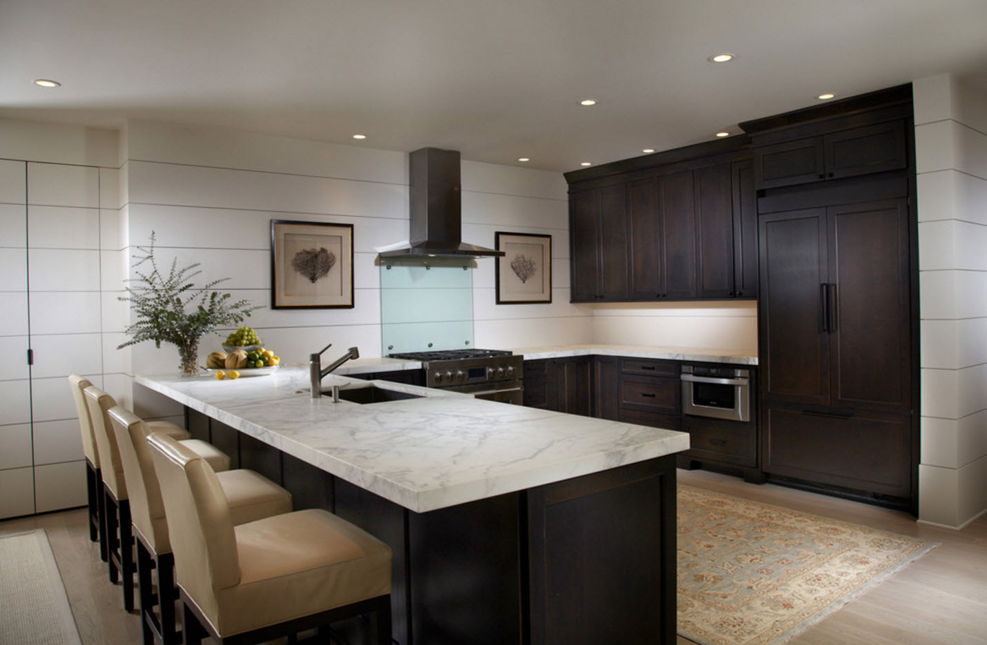 Преимущество просторных кухонных помещений в том, что можно использовать популярные цветовые решения. Например, контрастные сочетания в исполнении фасадов кухонных шкафов. Никто не станет спорить с тем, что цветовая палитра кухонного интерьера во многом зависит от выбора оттенков для исполнения мебельного гарнитура, ведь он занимает большую часть полезного пространства. Темные фасады на светлом фоне отделки кухонного пространства смотрятся очень эффектно, добавляя интерьеру респектабельности и шика. А применение темного тона для исполнения нижнего яруса шкафов в сочетании со светлым оттенком для навесных систем хранения, позволяет визуально увеличить высоту помещения.