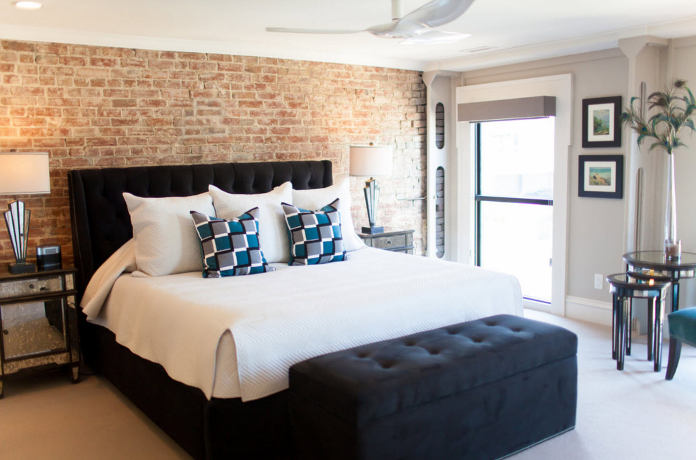Еще одной особенностью отделки помещений в частных домах становится использование индустриальных мотивов. Довольно оригинально в загородном доме, например, встретить бетонные или кирпичные стены в качестве акцентов отделки спальни или гостиной, кухни или столовой. Это могут быть как первозданные поверхности (настоящая кирпичная кладка или бетонная стена), так и эффектные имитации, выполненные при помощи жидких обоек, настенной плитки или декоративной штукатурки.