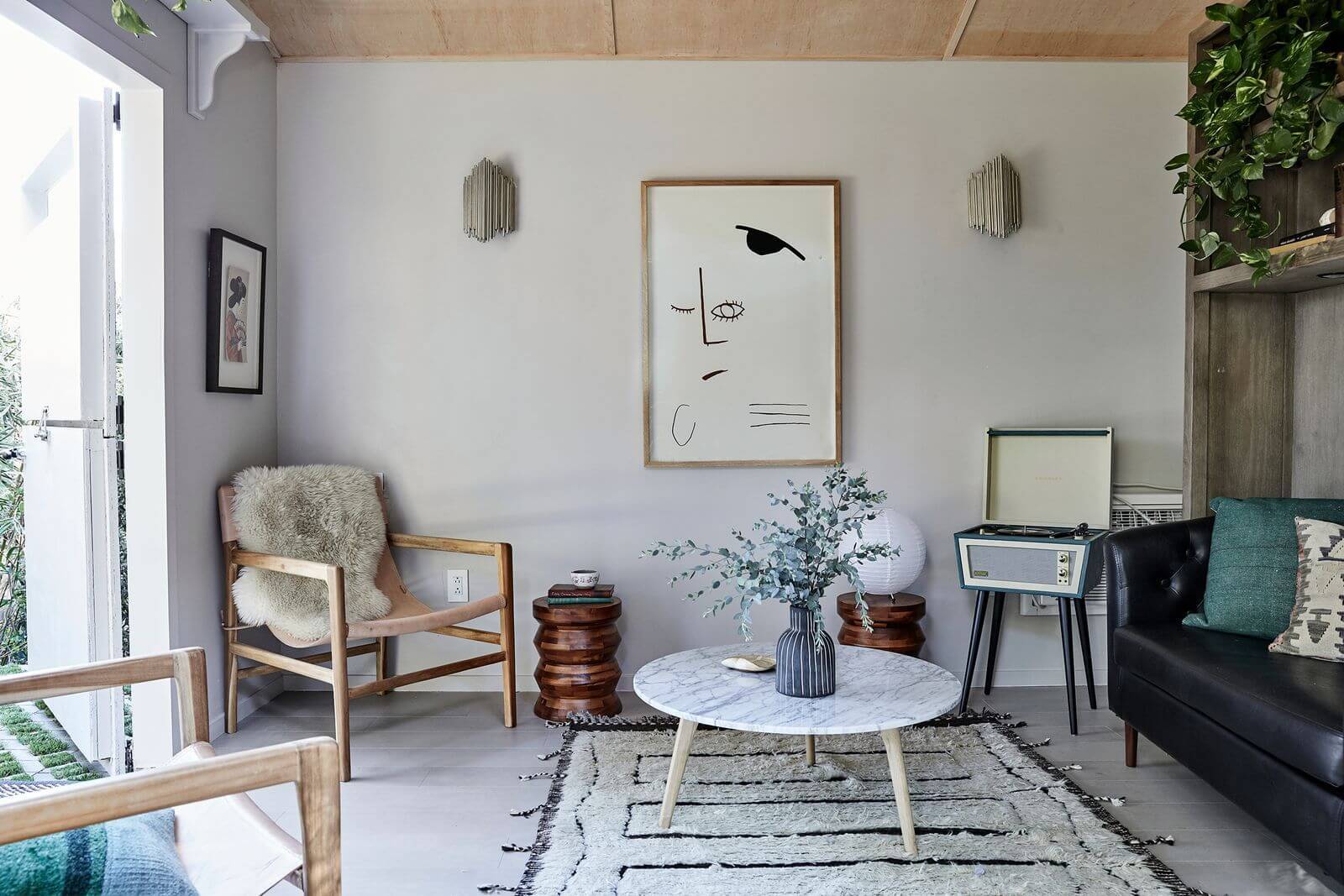 В интерьере в стиле джапанди декор должен быть функциональным и простым. Подойдут лампы с глиняными основаниями, керамические вазы и горшки, минималистичные постеры или картины, а также предметы, сделанные своими руками, например, джутовые коврики, плетёные абажуры и корзинки из ротанга. Растения в горшках также отлично впишутся в такой интерьер.