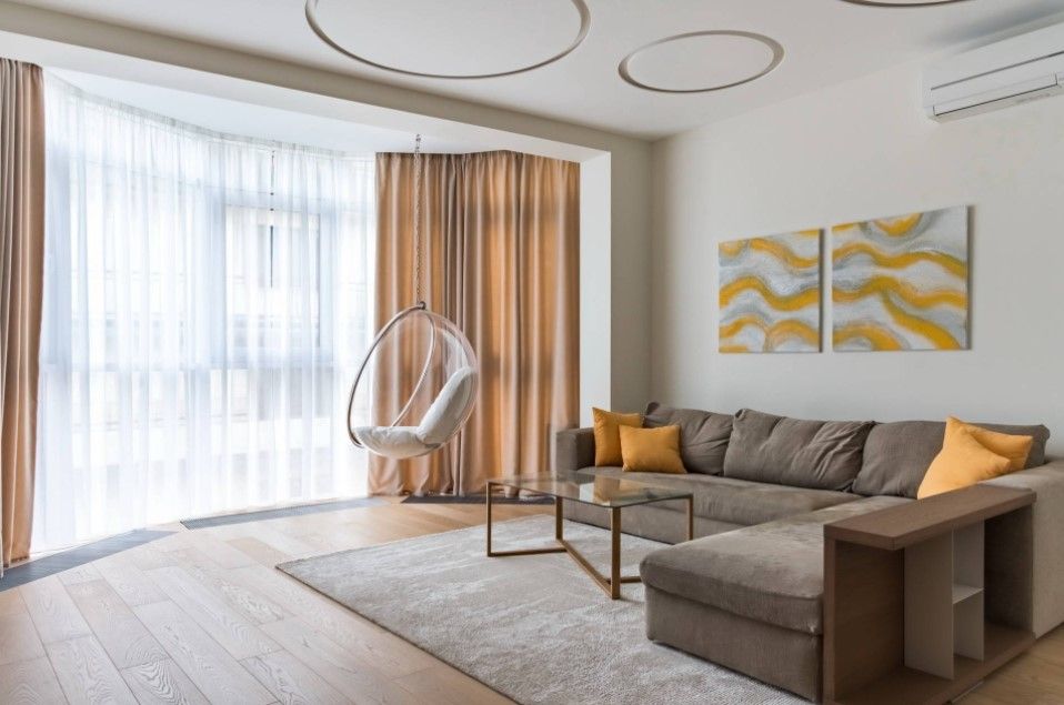В тренде сдержанный и спокойный фон, на котором допустимы броские детали, что позволит создать в помещение ощущение чистоты и пространства. А это полностью соответствует критериям стильных идей интерьера 2022 для гостиной комнаты.