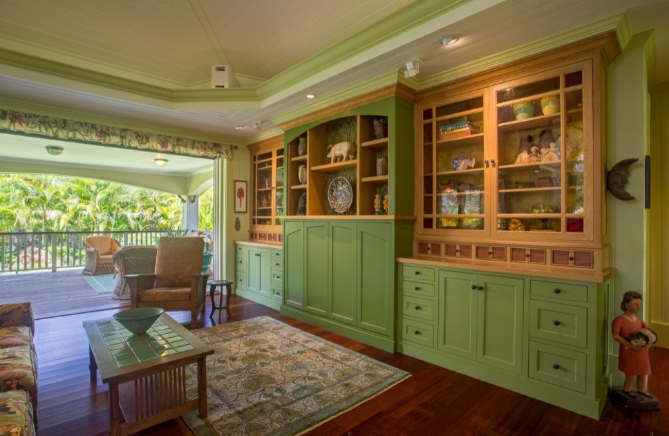 Интерьерам свойственна массивная мебель, включая тумбы, столы, мягкую часть и гарнитуры. Вся эта обстановка представлена в сочетании с натуральными материалами.