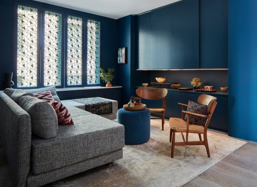 Голубой или бледно-синий лидирует среди прочих колеров. Он также из разряда холодной палитры, подойдет для тех, кто начинает жизнь заново с интерьера. Цвет является выходцем из комбинаторной гаммы и лучше всего сочетается с коричневым или древесным.