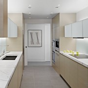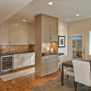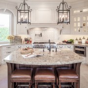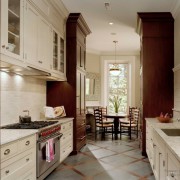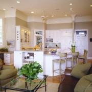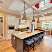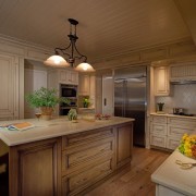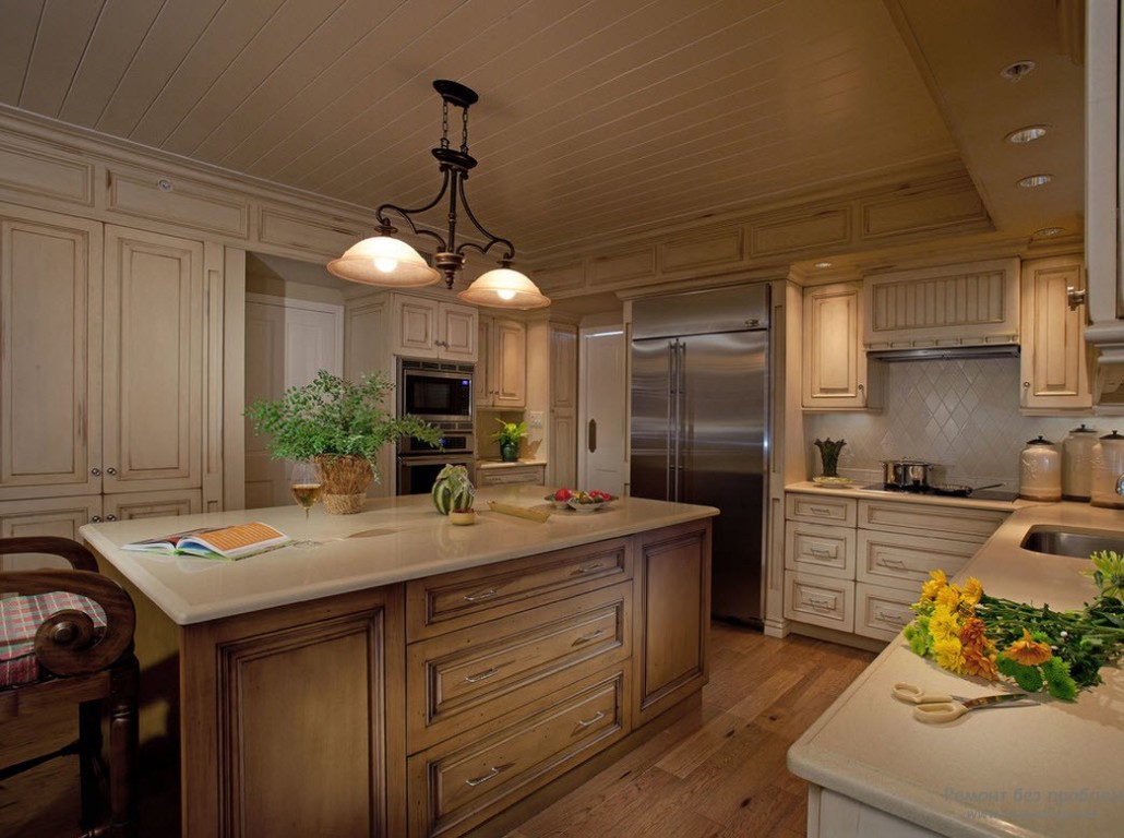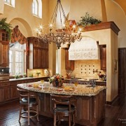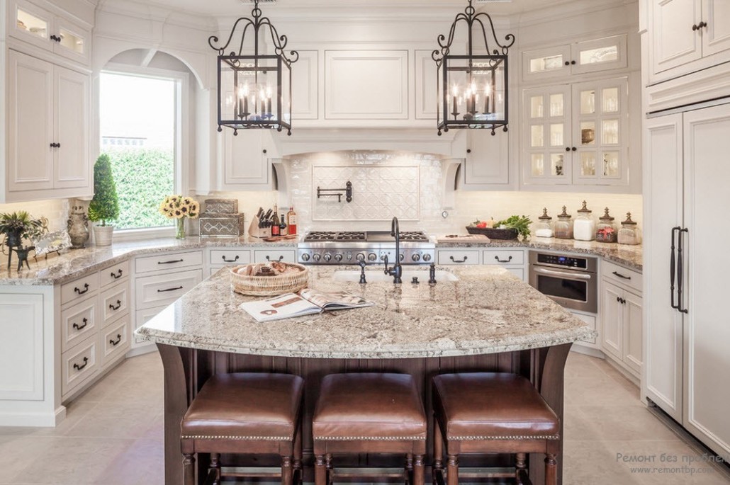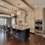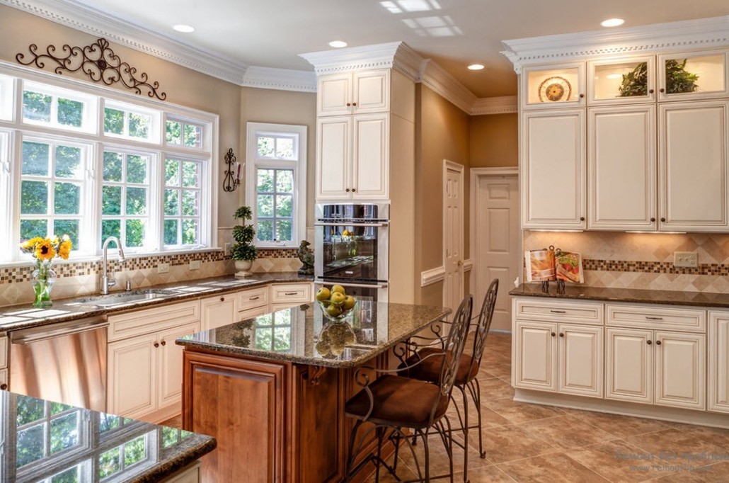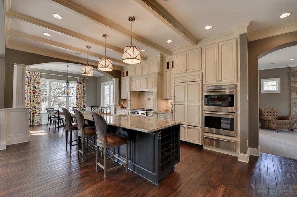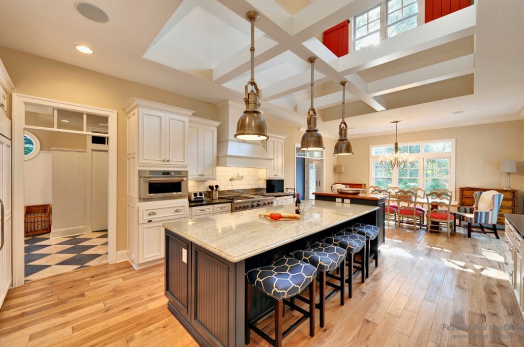 Отшпаклеванный и окрашенный белой краской потолок с точечным освещением вдоль рабочей зоны – очень популярный дизайнерский ход для кухни, который впишется в любой интерьер. Рабочая стенка, выложенная мелкой плиткой и кухонный гарнитур, включая каркас стульев и стола, белые, как бы дополняющие друг друга элементы декора. Столешницы рабочей и обеденной зоны в цвете темного шоколада очень оригинально разбавят обволакивающее пространство, создав в нем контрастные элементы. Пол и столешница так называемого острова или другими словами передвижного столика с ящичками и полками для мелочей, выполнены в цвете дерева бук, идеально сочетаются между собой и вносят в холодную атмосфер помещения ноты солнечного света. Окрашенные или оклеенные фактурными обоями стены в нейтральном, но в то же время насыщенном бежевом цвете идеально гармонируют со шторами на окнах и обивкой внешней спинки стульев. Светильники над рабочей поверхностью острова и над обеденным столом совершенно разные по форме, но смотрятся вполне гармонично из-за цветового решения. В том же джинсово-синем цвете выполнены и сиденья стульев. Все эти мелочи и использование цветов настолько переплетены между собой, что каждый отдельно взятый элемент кажется неотъемлемой частью интерьера. И именно такой гармонии необходимо достичь при создании дизайна кухни. Также следует отметить, что в любом дизайне важны декоративные элементы. В данном случае это белоснежные вазоны и светильники, которые идеально вписались в общую картину, превосходно завершив весь ансамбль убранства кухни.