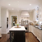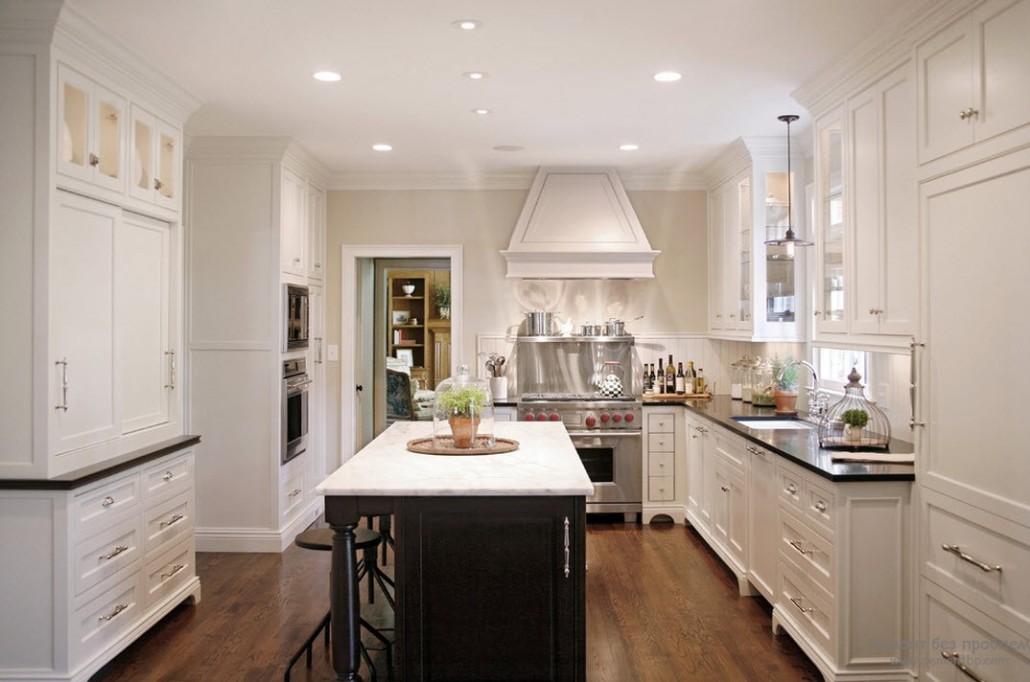 При этом напольное покрытие и отделку рабочей стены можно оформить в цвет рабочей зоны, а потолок окрасить в белый цвет и расположить на нем точечное освещение. В такой дизайн гармонично впишутся белоснежные литые стулья на тонких хромированных ножках, а контрастной изюминкой станет остров с оранжевыми стенками и фасадами ящиков, накрытый белой столешницей. Для того чтобы он не смотрелся лишним его присутствие нужно поддержать несколькими соответствующими по цвету элементами декора в отделке стены рабочей зоны или простыми аксессуарами.
