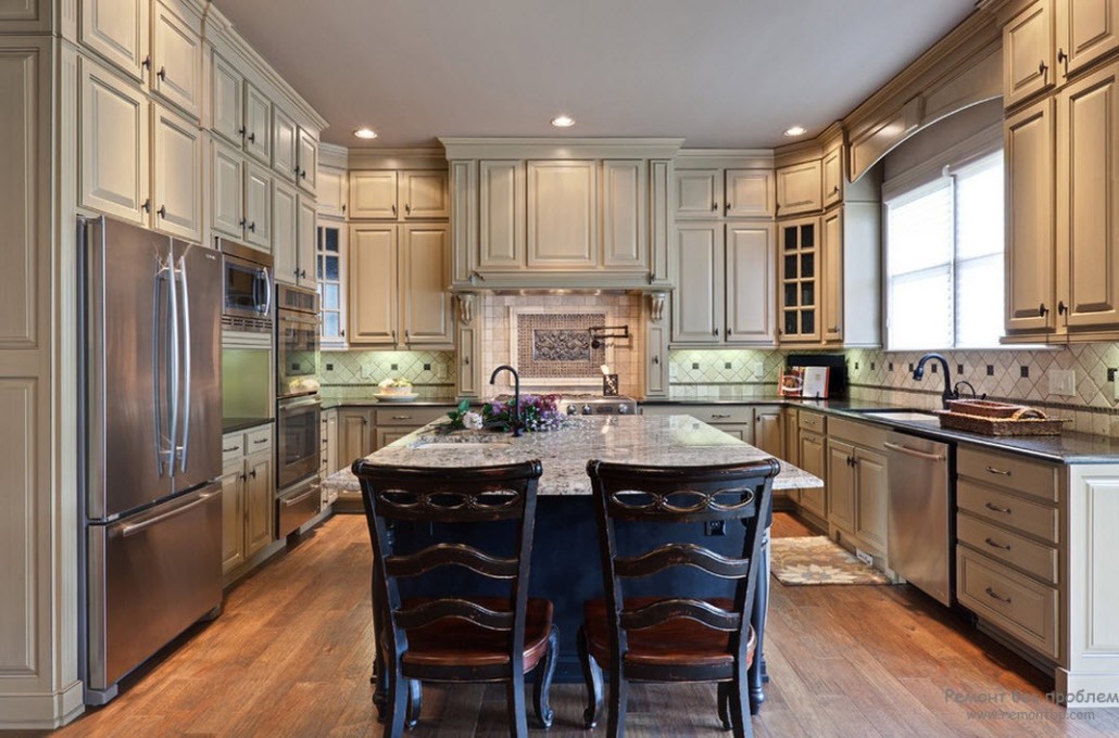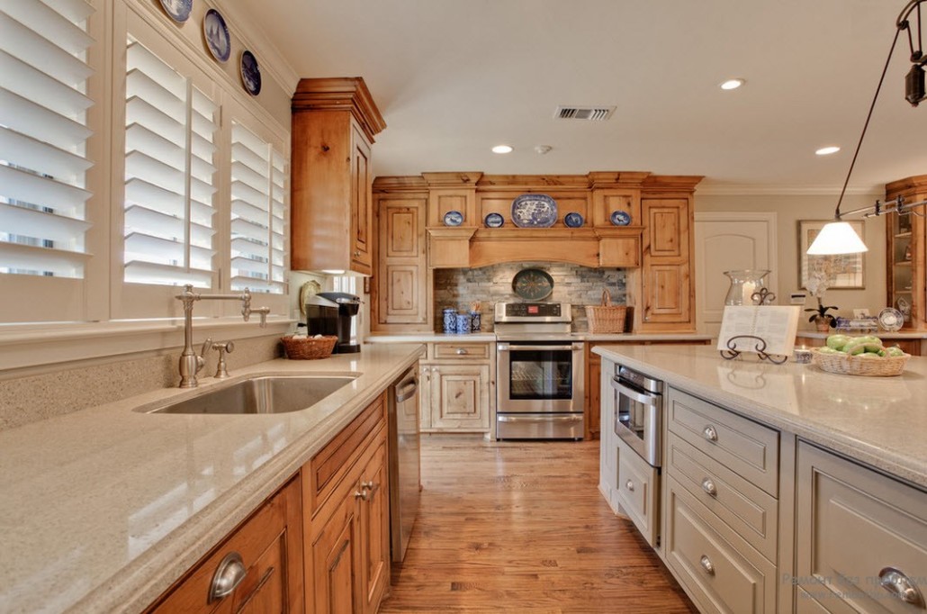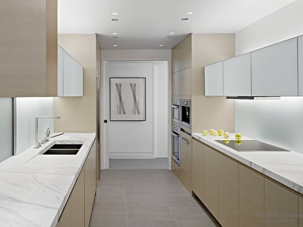 К примеру, это может быть светлый пол под паркет, стены, окрашенные в темный бежевый тон, в цвет которому подобрана столешница, сделанная под натуральный камень с серыми и пшенично-желтыми разводами. В такую атмосферу гармонично впишется светло-бежевый кухонный гарнитур с алюминиевыми ручками и техника в цвете металлик.
