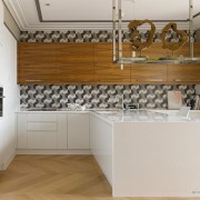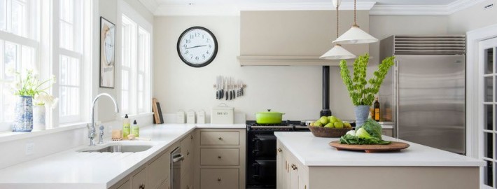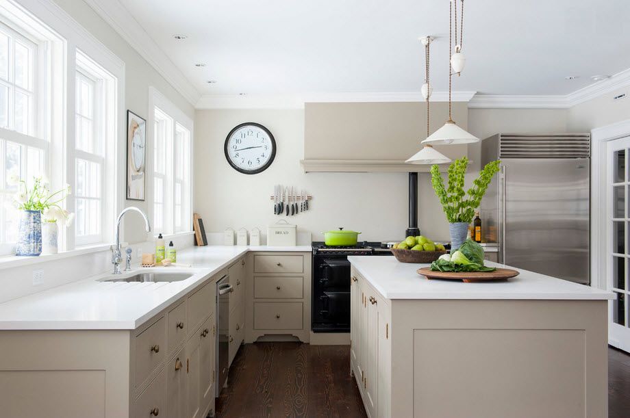 Замечательным решением может стать оформление кухни с яркими контрастами. Интересно будет смотреться сочетание холодного серо-бежевого с белым и ярко-оранжевым цветами. При этом не обязательно подбирать мебель в одном цветовом решении. В большом помещении можно разграничить пространство кухни, сделав рабочую зону под дерево туя, с белой столешницей, а вдоль второй стены установить шкафа с белой глянцевой поверхностью.