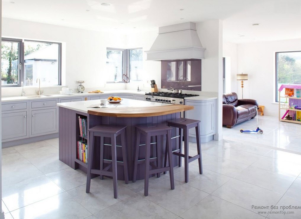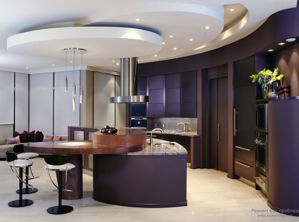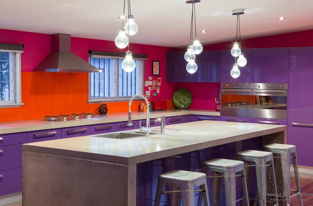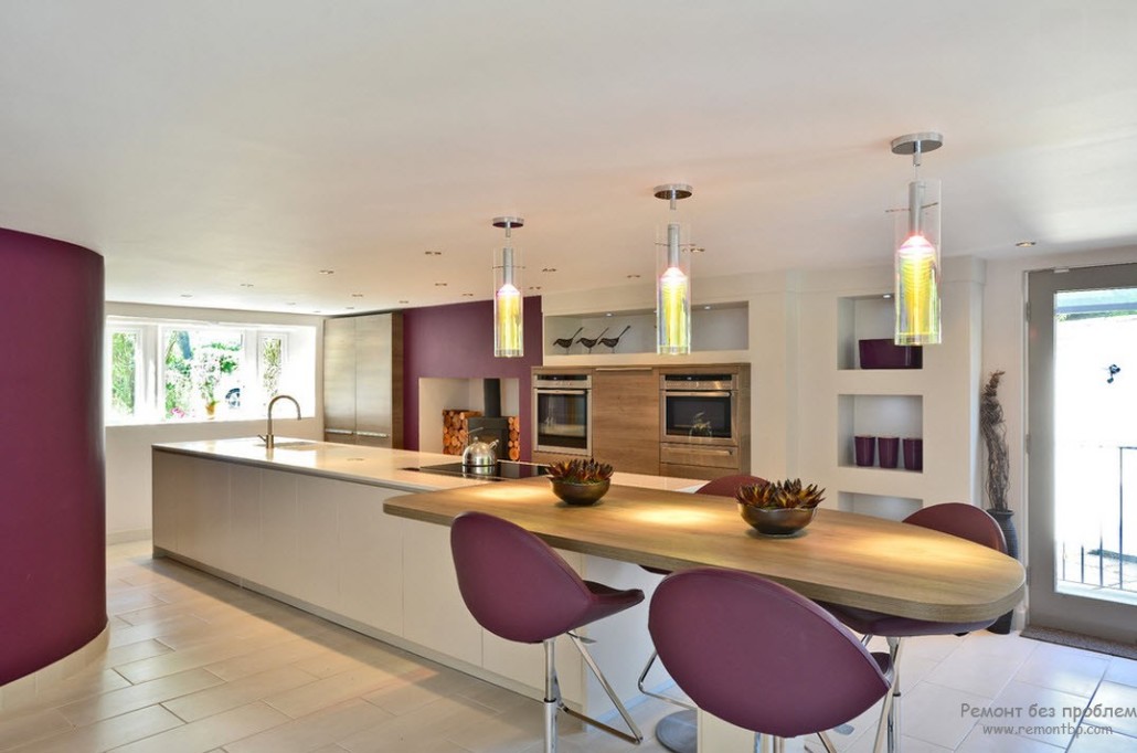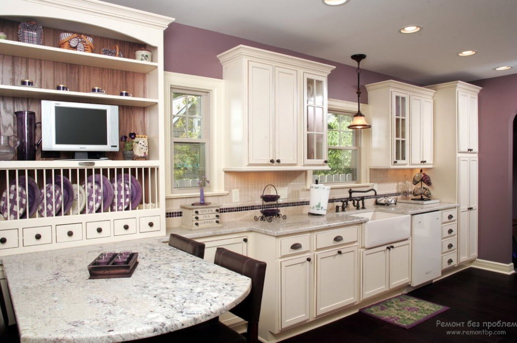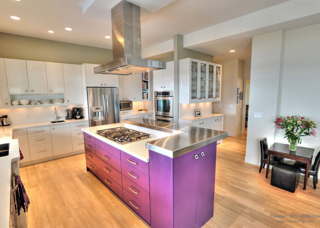 Наиболее подходящими для этой цели являются такие оттенки фиолетового как лавандовый, красно-фиолетовый, фиалковый, пурпурный, сливовый, сине-фиолетовый, аметистовый и ежевичный. Причем все эти тона можно использовать в сочетании друг с другом или же с другими цветами. Все зависит от того какой вы хотите видеть свою кухню. Если, к примеру, это ультрамодная кухня в стиле модерн или арт-деко, то здесь идеальным будет сочетание фиолетового с белым, причем нейтральность последнего позволяет скомбинировать его как с теплыми, так и с холодными оттенками фиолетового.