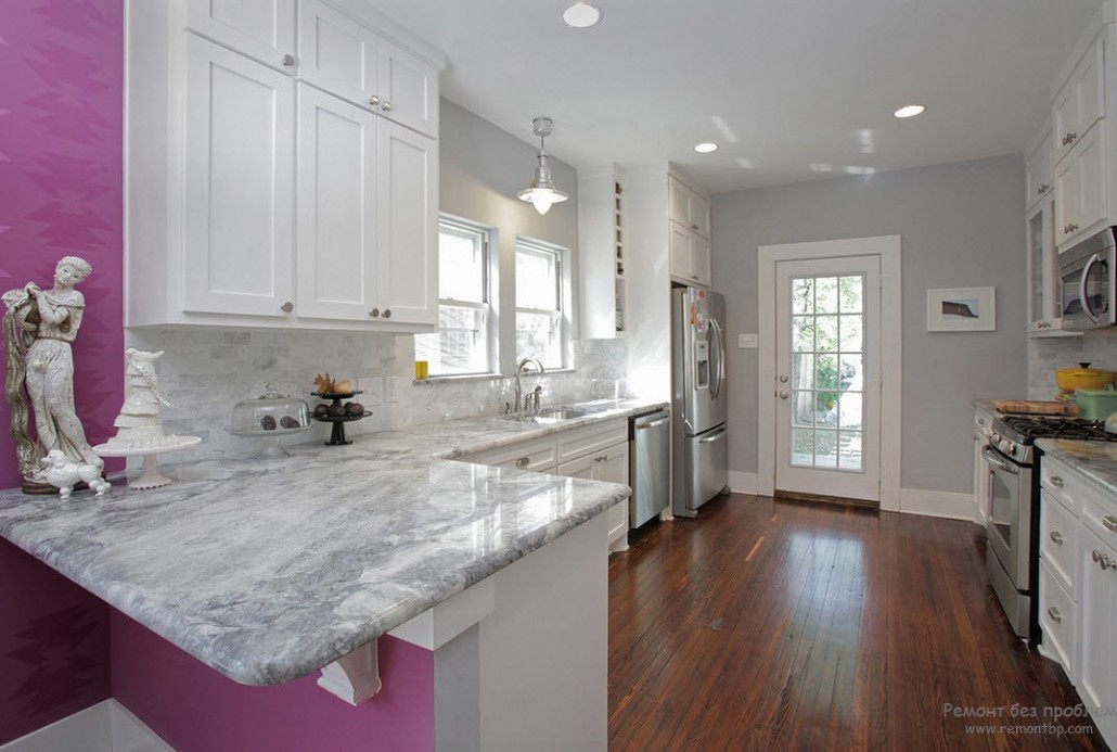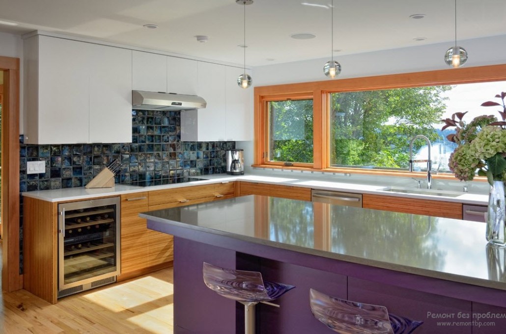 Такое сочетание может применяться как в чистом виде, так и быть разбавленным цветом натуральных темных пород дерева и камня. Превосходно будет смотреться такая кухня в квартире студии, где зона кухни будет в темных тонах, а зона отдыха с диваном и журнальным столиком в светлых. Уместным здесь будет подушечный декор, поддерживающий стилистику кухни. Превосходным решением для кухни станет оформление кухни с использованием фиолетового цвета лишь в качестве отдельных акцентов, в виде рабочей стены и обеденной зоны.