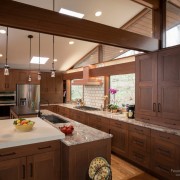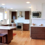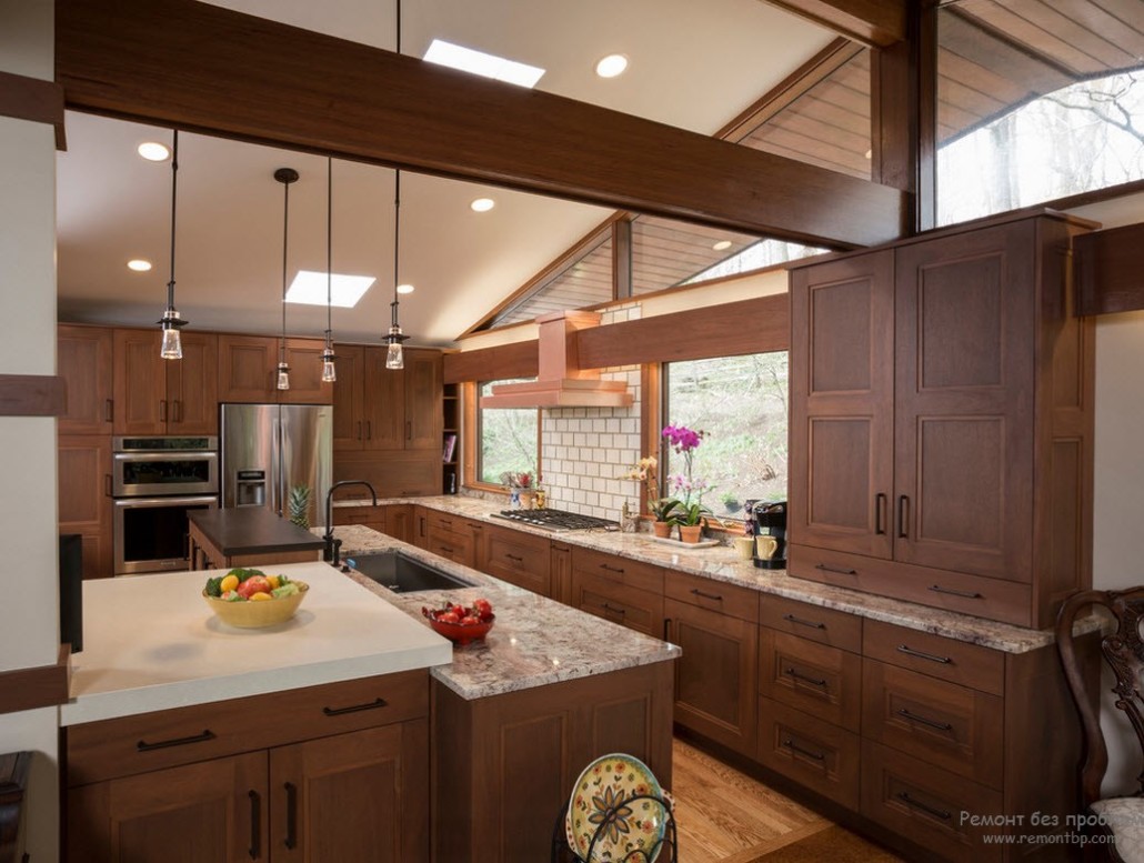 Классика жанра для кухни – мебель из натуральной древесины. Но в наше время для многих мебель из массива недоступна из-за своей дороговизны. Но вот мебель из более дешевых материалов, сделанных под натуральное дерево – идеальный вариант. И тут просто огромнейший выбор оттенков, начиная от черно-коричневого венге и заканчивая цветом какао с молоком. Причем все они могут сочетаться и переплетаться между собой, создавая неповторимую и самое главное комфортную атмосферу.