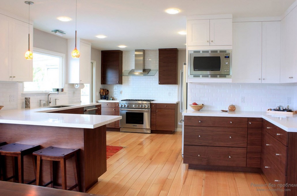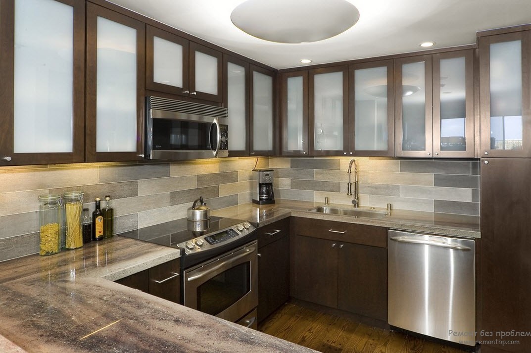 Оригинально в оформлении кухни смотрится сочетание темно-коричневого с белым и серым цветом. Такая кухня выглядит очень элегантно и сдержанно. Сочетание цветов в таком интерьере необходимо сделать максимально спокойным. Поэтому вся техника на кухня должна быть в цвете металлик, столешница под натуральный камень в сером цвете с коричневыми вкраплениями, а в рабочей зоне плитка, которая является основным декоративным элементом, объединяющим все использованные оттенки.
