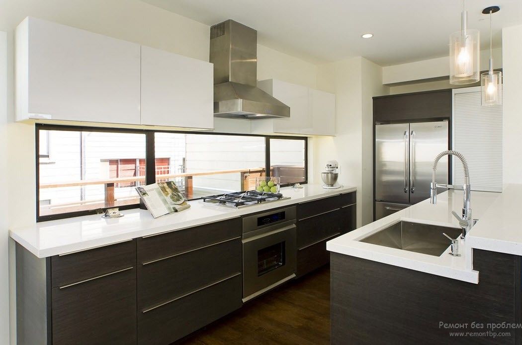 Если грамотно подойти к оформлению такой кухни, можно добиться эффекта визуального увеличения пространства. Особенно, если помещение имеет нестандартную форму, при которой длина значительно превышает ширину. При таком раскладе также уместна мойка у окна, маскирующая батареи.