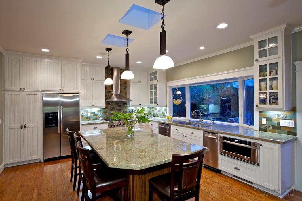 Окно необходимо на кухне так же, как и в любом другом помещении, т.к. освещение солнечным светом играет очень важную роль в оформлении любой комнаты. Естественные солнечные лучи проникают в помещение и рассеиваются, что делает кухню более живой и теплой. Что касается дизайна, то в подавляющем большинстве случаев он сводится к тому, что у окна располагается или стол, или мойка.