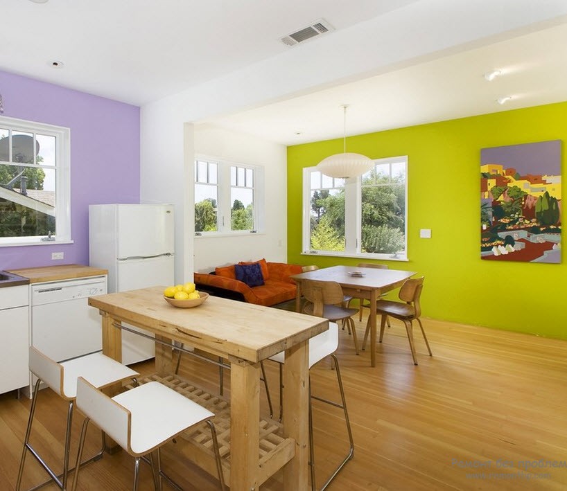 Для более насыщенного интерьера можно сочетать салатовый цвет с благородной бирюзой, а также с нежными оттенками сиреневого и желтого.