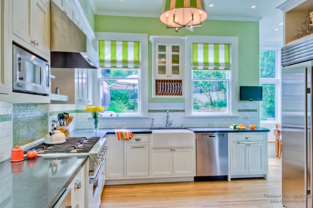 - Чем рельефнее фасад кухонной мебели, тем нежнее должен быть салатовый оттенок.
