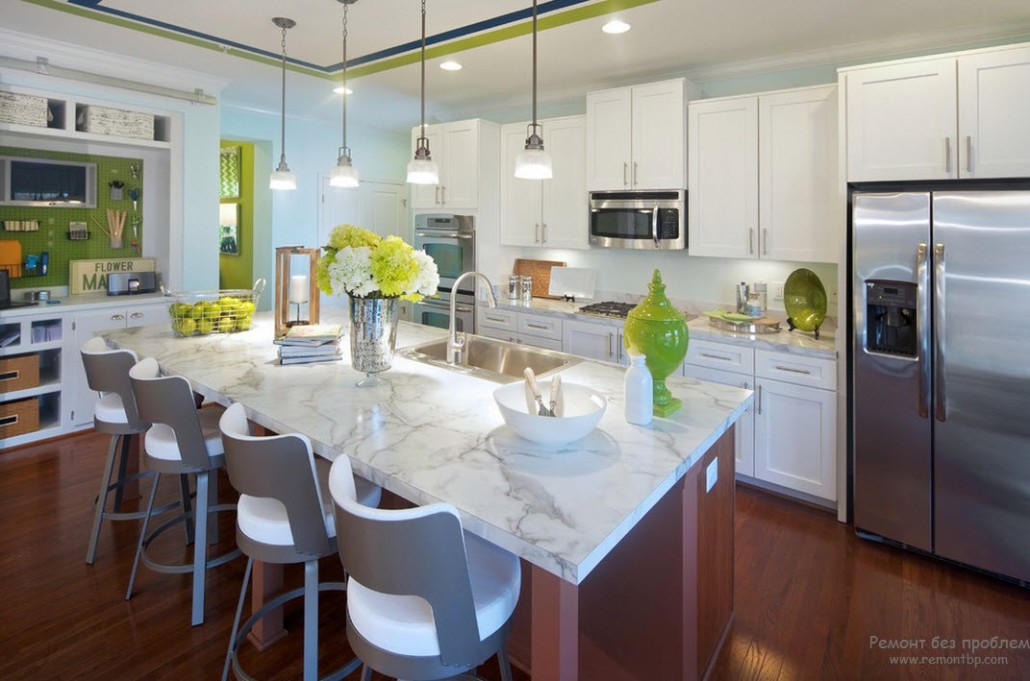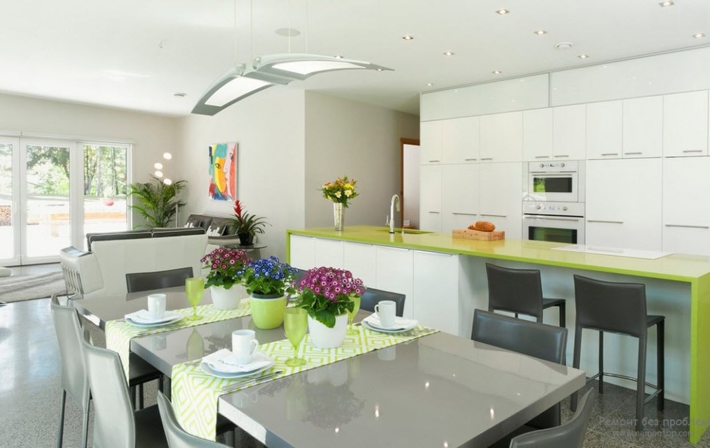 Для создания уютной кухни, в которой будет приятно заниматься приготовлением пищи, проводить семейные вечера и принимать гостей нужно не только правильно расположить все необходимые элементы мебели, декора и техники, но и эстетично и грамотно распределить цвета. Поскольку салатовый цвет достаточно яркий и насыщенный его следует разбавлять более спокойными и нейтральными красками: белым, серым, коричневым или черным.