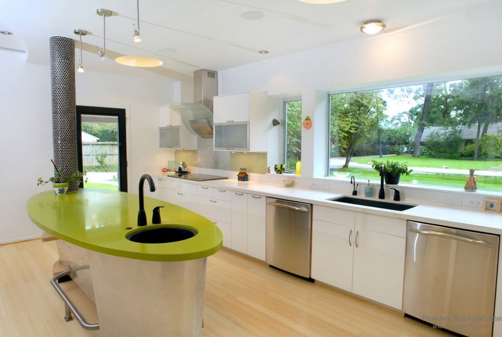 Как показывает практика дизайнеров, лучше всего кухни яркого салатового цвета смотрятся в современной интерпретации. А вот для более классических и аристократичных стилей следует подбирать нежные и благородные оттенки этого цвета.