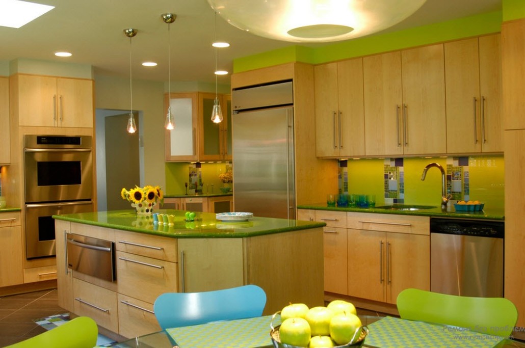 - Не обязательно все стены выкрашивать в салатовый цвет, ярким акцентом может быть лишь одна из них, а вот поддержать тематику можно идентичным фартуком или несколькими элементами декора.