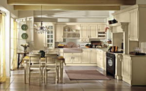 Для отделки пола принято использовать ламинат, паркетные доски или дерево. В рабочей области, где расположено наибольшее количество техники и мебель, на полу используют керамическую плитку. Стены возле рабочих поверхностей оформляют гладким кафелем или специальной панелью из стекла с характерным орнаментом.