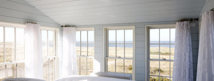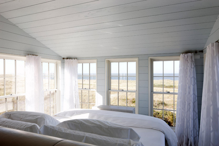 С целью визуального увеличения пространства рекомендуется использовать низкую мебель (кровать, прикроватные тумбочки). В совокупности с длинными, почти от потолка, шторами, этот прием позволит зрительно увеличить высоту вашей спальни.