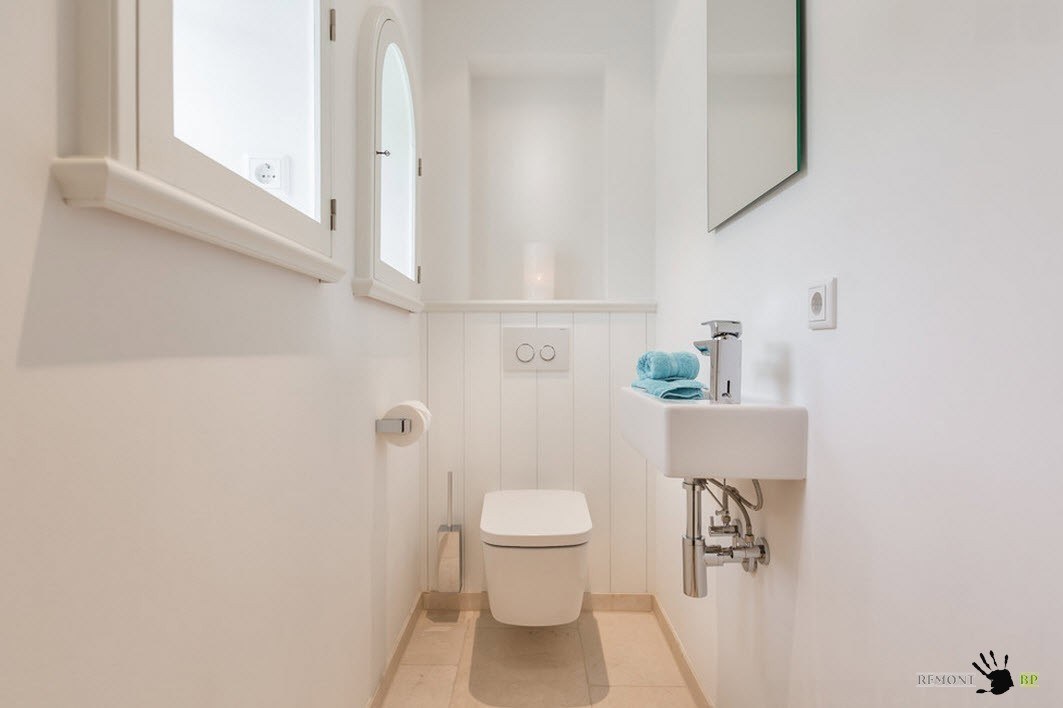 Ванные комнаты находятся на втором этаже, возле спален, а на первом уровне частного дома оборудован небольшой санузел с неизменно белоснежной отделкой. Консольный унитаз со скрытым сливным бачком не только экономит полезное пространство утилитарного помещения, но и выглядит эстетически привлекательно. Небольшая раковина с поворотным смесителем тоже занимает немного места. В итоге, узкое, но длинное помещение санузла не выглядит загруженным, сохраняет ощущение некоторого простора.